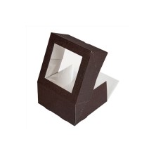 Cajas Pastelería Con Ventana Chocolate 28 x 28 x 10 cm. Cajas de pastelería fabricadas en cartón nano - micro ondulado con 250 g/m². Con ventana OPP fácil de quitar con alta visibilidad. Apertura frontal que permite introducir y retirar los postres con facilidad. Muy resistentes y ligeras. Biodegradables y reciclable. Aguanta temperaturas de -18ºC hasta +70ºC. Dimensiones: 28 x 28 x 10 cm.